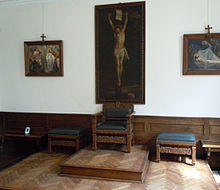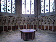 The community of monks would meet in the chapter house with the abbot to "hold chapter"; that is, "for the reading of the "Martyrology" and the "Necrology", for the correction of faults, the assigning of the tasks for the day, and for the exhortation of the superior, and again for the evening Collation or reading before Complin".[1] The first meeting took place in the morning, after the church services of Prime or Terce. The monks might sit along the length of the walls in strict age-order, apart from the office-holders.