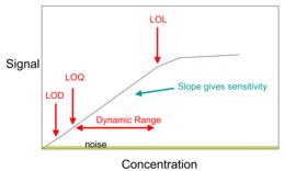A general method for analysis of concentration involves the creation of a calibration curve. This allows for determination of the amount of a chemical in a material by comparing the results of unknown sample to those of a series of known standards. If the concentration of element or compound in a sample is too high for the detection range of the technique, it can simply be diluted in a pure solvent. If the amount in the sample is below an instrument's range of measurement, the method of addition can be used. In this method a known quantity of the element or compound under study is added, and the difference between the concentration added, and the concentration observed is the amount actually in the sample.