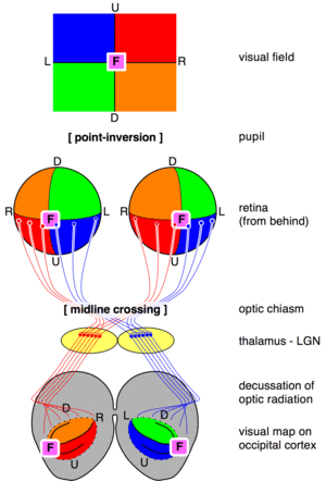 In the case of such partial decussation, the optic nerve fibres on the medial sides of each retina (which correspond to the lateral side of each visual hemifield, because the image is inverted) cross over to the opposite side of the body midline. The inferonasal retina are related to the anterior portion of the optic chiasm whereas superonasal retinal fibers are related to the posterior portion of the optic chiasm.