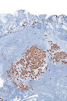 It is used as an indicator for pancreas and prostate cancer[10] and in carcinoid syndrome.[11][12] It might play a role in early neoplasic progression. Chromogranin A is cleaved by an endogenous prohormone convertase to produce several peptide fragments. See chromogranin A GeneRIFs for references. In immunohistochemistry it can be used to identify a range of neuroendocrine tumours and is highly specific for both benign and malignant cells of this type.[13]