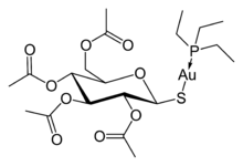 Gold salts are ionic chemical compounds of gold. The term, "gold salts" is a misnomer, and is the term for the gold compounds used in medicine. "Chrysotherapy" and "aurotherapy" are the applications of gold compounds to medicine.[1] Contemporary research on the effect of gold salts treatment began in 1935,[2] primarily to reduce inflammation and to slow disease progression in patients with rheumatoid arthritis. The use of gold compounds has decreased since the 1980s because of numerous side effects and monitoring requirements, limited efficacy, and very slow onset of action. Most chemical compounds of gold, including some of the drugs discussed below, are not salts, but are examples of metal thiolate complexes.