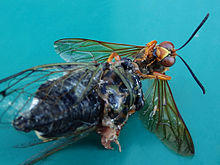 Cicada killer wasps (the genus Sphecius) are large, solitary, ground dwelling, predatory wasps. They are so named because they hunt cicadas and provision their nests with them, after stinging and paralyzing them. There are 21 species worldwide. The highest diversity occurs in the region between North Africa and Central Asia.