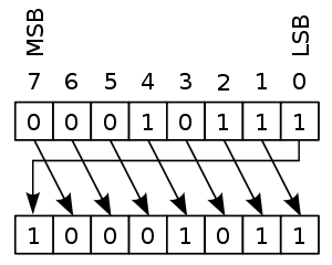 | right circular shift by 7 positions: | 0010 1101 |