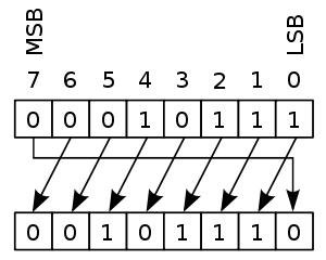 In computer programming, a bitwise rotation, also known as a circular shift, is a bitwise operation that shifts all bits of its operand. Unlike an arithmetic shift, a circular shift does not preserve a number's sign bit or distinguish a floating-point number's exponent from its significand. Unlike a logical shift, the vacant bit positions are not filled in with zeros but are filled in with the bits that are shifted out of the sequence.