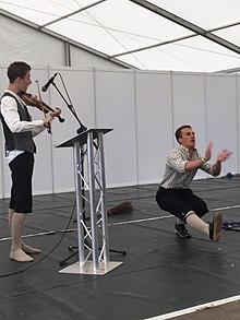 Clog dancing is an integral part of both the local and national eisteddfod tradition in Wales. Competitions since the 1960s have extended to dancing duets and trios which meant that groups could recreate on stage the true tradition where one dancer was trying to out-dance the other. Group clogging has also become an integral part of the eisteddfodau and dancing tradition.[7] Competition can be energetic with the dancers leaping over brooms as seen in the National Eisteddfod Male Welsh Clog Dancing Competition". Notable dancing groups include Natgarw Dancers hailing from the Pontypridd area and Talog dancers from Camarthern. Both groups have enjoyed significant success in National Eisteddfod competitions. Nantgarw dancers have also had significant success in international competitions such as the Llangollen International Eisteddfod in Wales, Lorient Folk Festival in France and Mallorca World Folk Festival in Spain.[8][9]