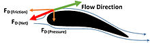 The drag coefficient of any object comprises the effects of the two basic contributors to fluid dynamic drag: skin friction and form drag. The drag coefficient of a lifting airfoil or hydrofoil also includes the effects of lift-induced drag.[4][5] The drag coefficient of a complete structure such as an aircraft also includes the effects of interference drag.[6][7]