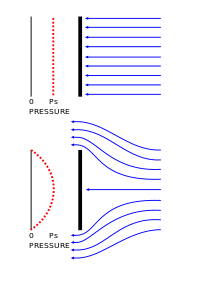 A equal to 1 would be obtained in a case where all of the fluid approaching the object is brought to rest, building up stagnation pressure over the whole front surface. The top figure shows a flat plate with the fluid coming from the right and stopping at the plate. The graph to the left of it shows equal pressure across the surface. In a real flat plate, the fluid must turn around the sides, and full stagnation pressure is found only at the center, dropping off toward the edges as in the lower figure and graph. Only considering the front side, the of a real flat plate would be less than 1; except that there will be suction on the backside: a negative pressure (relative to ambient). The overall of a real square flat plate perpendicular to the flow is often given as 1.17. Flow patterns and therefore for some shapes can change with the Reynolds number and the roughness of the surfaces.