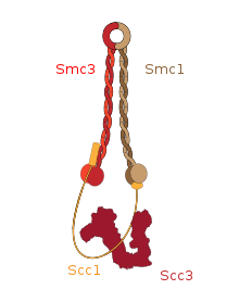 Cohesin is a protein complex that mediates sister chromatid cohesion, homologous recombination and DNA looping. Cohesin is formed of SMC3, SMC1, SCC1 and SCC3 (SA1 or SA2 in humans). Cohesin holds sister chromatids together after DNA replication until anaphase when removal of cohesin leads to separation of sister chromatids. The complex forms a ring-like structure and it is believed that sister chromatids are held together by entrapment inside the cohesin ring. Cohesin is a member of the SMC family of protein complexes which includes Condensin, MukBEF and SMC-ScpAB.