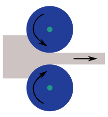 Flat rolling is the most basic form of rolling with the starting and ending material having a rectangular cross-section. The material is fed in between two rollers, called working rolls, that rotate in opposite directions. The gap between the two rolls is less than the thickness of the starting material, which causes it to deform. The decrease in material thickness causes the material to elongate. The friction at the interface between the material and the rolls causes the material to be pushed through. The amount of deformation possible in a single pass is limited by the friction between the rolls; if the change in thickness is too great the rolls just slip over the material and do not draw it in.[1] The final product is either sheet or plate, with the former being less than 6 mm (0.24 in) thick and the latter greater than; however, heavy plates tend to be formed using a press, which is termed forging, rather than rolling.