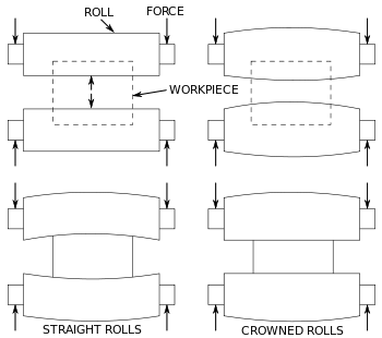 Maintaining a uniform gap between the rolls is difficult because the rolls deflect under the load required to deform the workpiece. The deflection causes the workpiece to be thinner on the edges and thicker in the middle. This can be overcome by using a crowned roller (parabolic crown), however the crowned roller will only compensate for one set of conditions, specifically the material, temperature, and amount of deformation.[11]