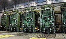 The first rail rolling mill was established by John Birkenshaw at Bedlington Ironworks in Northumberland, England in 1820, where he produced fish-bellied wrought iron rails in lengths of 15 to 18 feet.[8] With the advancement of technology in rolling mills, the size of rolling mills grew rapidly along with the size of the products being rolled. One example of this was at The Great Exhibition in London in 1851, where a plate 20 feet long, 3 ½ feet wide, and 7/16 of an inch thick, and weighing 1,125 pounds, was exhibited by the Consett Iron Company.[8] Further evolution of the rolling mill came with the introduction of three-high mills in 1853 used for rolling heavy sections.