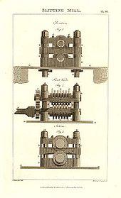 The invention of the rolling mill in Europe may be attributed to Leonardo da Vinci in his drawings.[3] The earliest rolling mills in crude form but the same basic principles were found in Middle East and South Asia as early as 600 BCE. Earliest rolling mills were slitting mills, which were introduced from what is now Belgium to England in 1590. These passed flat bars between rolls to form a plate of iron, which was then passed between grooved rolls (slitters) to produce rods of iron.[4] The first experiments at rolling iron for tinplate took place about 1670. In 1697, Major John Hanbury erected a mill at Pontypool to roll 'Pontypool plates' – blackplate. Later this began to be rerolled and tinned to make tinplate. The earlier production of plate iron in Europe had been in forges, not rolling mills.