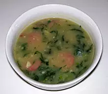 Thinly-sliced collard greens are also a main part of the popular Portuguese soup, caldo verde ("green broth"). For this broth, the leaves are sliced into strips, 2–3 mm (3&fras1;321&fras1;8 in) wide (sometimes by a grocer or market vendor using a special hand-cranked slicer) and added to the other ingredients 15 minutes before it is served.