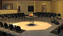 St. Paul's Collegiate Church at Storrs features contemporary architecture reflecting traditional collegiate church architecture (pictured). Unlike most historical collegiate churches, this is a non-denominational, evangelical church. According to church leaders, they chose the name "collegiate" to emphasize "the priesthood of all believers" and that "every member of the Body of Christ is a minister." While collegiate churches typically have its seating arranged parallel with the south and north walls, facing inwards rather than towards the altar at the eastern end, St. Paul's Collegiate Church has adapted this by creating a chapel fully in the round, with the altar/communion station in the center.