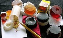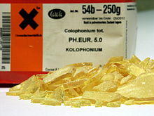 Rosin, also called colophony or Greek pitch (Latin: pix graeca), is a solid form of resin obtained from pines and some other plants, mostly conifers, produced by heating fresh liquid resin to vaporize the volatile liquid terpene components. It is semi-transparent and varies in color from yellow to black. At room temperature rosin is brittle, but it melts at stove-top temperature. It chiefly consists of various resin acids, especially abietic acid.[1] The term "colophony" comes from colophonia resina, Latin for 'resin from Colophon', an ancient Ionic city.[2]