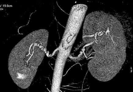 Visualization of blood flow in the renal arteries (those supplying the kidneys) in patients with high blood pressure and those suspected of having kidney disorders can be performed using CTA. Stenosis (narrowing) of a renal artery is a cause of hypertension (high blood pressure) in some patients and can be corrected. A special computerized method of viewing the images makes renal CT angiography a very accurate examination.[5] CTA is also used in the assessment of native and transplant renal arteries.[2] While CTA is great for imaging of the kidneys, it lacks the ability to perform procedures at the same time. Thus traditional catheter angiography is used in cases of acute renal hemorrhage or acute arterial obstruction.[1]