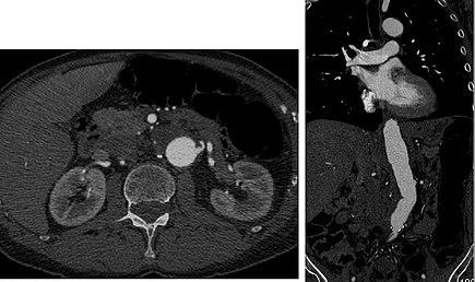 CTA can be used in the chest and abdomen to identify aneurysms in the aorta or other major blood vessels. These areas of weakened blood vessel walls that bulge out can life-threatening if they rupture. CTA is the test of choice when assessing aneurysm before and after endovascular stenting due to the ability to detect calcium within the wall.[2] Another positive of CTA in abdominal aortic aneurysm assessment is it allows for better estimation of blood vessel dilation and can better detect blood clots as compared to standard angiography.[3]