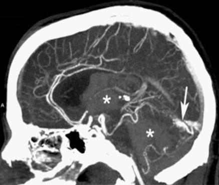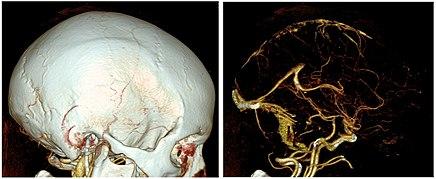 CTA can be used assess acute stroke patients by identifying clots in the arteries of the brain.[1] It can also be used to identify small aneurysms or arteriovenous malformation inside the brain that can be life-threatening. While CTA can produce high quality images of the carotid arteries for grading the level of stenosis (narrowing of the vessel), calcium deposits (calcified plaques) in the area where the vessels split can lead to interference with accurate stenosis grading. Because of this, magnetic resonance angiography is used more often for this purpose.[2]