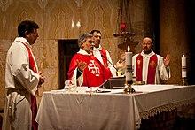 In Christianity, concelebration (from Lat., con + celebrare, to celebrate together) is the presiding of a number of presbyters (priests or ministers) at the celebration of the Eucharist with either a presbyter or bishop as the principal celebrant and the other presbyters and bishops present in the chancel assisting in the consecration of the Eucharist. The concelebrants assist the principal celebrant by reciting the Words of Consecration together with him, thus effecting the change of the eucharistic elements. They may also recite portions of the Eucharistic Prayer.[1] Concelebration is often practiced by ministers/priest of Churches that are in full communion with one another, e.g. the Anglican Communion and the Old Catholic Church.[2]