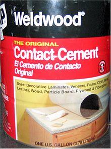 Impact glue, contact glue or neoprene glue, is a type of glue, used mainly to glue plastic foams, laminates, metal panels, etc. [1] It also allows the mounting of supports of different types (metal on wood, cork on plaster, wood on cement, etc).[1] Contact-type adhesives do not exclusively designate neoprene adhesives, but also all other adhesives characterized by high instant adhesion.