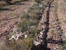 Contour bunding or contour farming or Contour ploughing is the farming practice of plowing and/or planting across a slope following its elevation contour lines. These contour lines create a water break which reduces the formation of rills and gullies during times of heavy precipitation, allowing more time for the water to settle into the soil.[1] In contour plowing, the ruts made by the plow run perpendicular rather than parallel to the slopes, generally furrows that curve around the land and are level. This method is also known for preventing tillage erosion.[2] Tillage erosion is the soil movement and erosion by tilling a given plot of land.[3] A similar practice is contour bunding where stones are placed around the contours of slopes. Contour ploughing helps to reduce soil erosion.