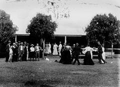 By the 1720s the term contradanse had come to refer to longways sets divided into groups of three or two couples, which would remain normative until English country dance's eclipse.[19] The earliest French works refer only to the longways form as contradanse,[20] which allowed the false etymology of "a dance in which lines dance opposite one another".[11] The square-set type also had its vogue in France and spread to much of Europe, Russia and North America during the later 18th century as the quadrille[21] and the cotillion. These usually require a group of eight people, a couple along each side. "Les Lanciers", a descendant of the quadrille, and the "Eightsome Reel" are examples of this kind of dance. Dancing in square sets still survives in Ireland, under the name "set dancing" or "figure dancing".