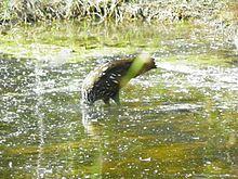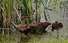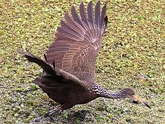 Limpkins forage primarily in shallow water and on floating vegetation such as water hyacinth and water lettuce.[16] When wading, they seldom go deeper than having half the body underwater, and never are submerged up to the back.[5] They walk slowly with a gait described as "slightly undulating" and "giving the impression of lameness or limping",[14] "high-stepping",[11] or "strolling",[12] looking for food if the water is clear or probing with the bill.[13][14] They do not associate with other birds in mixed-species feeding flocks, as do some other wading birds, but may forage in small groups with others of their species.[17]