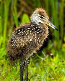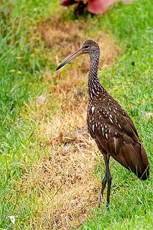 The limpkin (Aramus guarauna), also called carrao, courlan, and crying bird, is a large wading bird related to rails and cranes, and the only extant species in the genus Aramus and the family Aramidae. It is found mostly in wetlands in warm parts of the Americas, from Florida to northern Argentina. It feeds on molluscs, with the diet dominated by apple snails of the genus Pomacea. Its name derives from its seeming limp when it walks.[2]