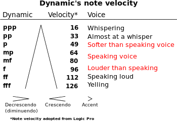 | Logic Pro 9 dynamics[24] | 16 | 32 | 48 | 64 | 80 | 96 | 112 | 127 | ||