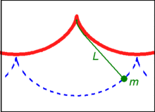 If a simple pendulum is suspended from the cusp of an inverted cycloid, such that the "string" is constrained between the adjacent arcs of the cycloid, and the pendulum's length L is equal to that of half the arc length of the cycloid (i.e., twice the diameter of the generating circle, L=4r), the bob of the pendulum also traces a cycloid path. Such a cycloidal pendulum is isochronous, regardless of amplitude. Introducing a coordinate system centred in the position of the cusp, the equation of motion is given by: