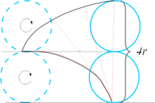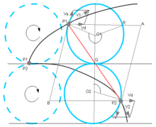 - Now consider the speed of . It can be seen as the sum of two components, the rolling speed and the drifting speed . Both speeds are equal in modulus because the circles roll without skidding. is parallel to and is tangent to the lower circle in therefore is parallel to . The rhombus constituted from the components and is therefore similar (same angles) to the rhombus because they have parallel sides. The total speed of is then parallel to because both are diagonals of two rhombuses with parallel sides and has in common with the contact point . It follows that the speed vector lies on the prolongation of . Because is tangent to the arc of cycloid in (property of velocity of a trajectory), it follows that also is coinciding with the tangent to the lower cycloid arc in .