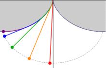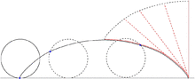 In geometry, a cycloid is the curve traced by a point on a circle as it rolls along a straight line without slipping. A cycloid is a specific form of trochoid and is an example of a roulette, a curve generated by a curve rolling on another curve.