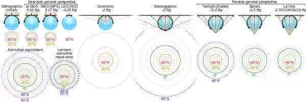 Comparison of some azimuthal projections centred on 90° N at the same scale, ordered by projection altitude in Earth radii. (click for detail)