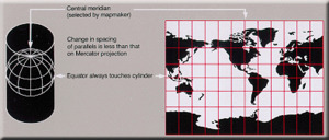 A Miller cylindrical projection maps the globe onto a cylinder.