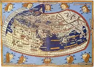 A medieval depiction of the Ecumene (1482, Johannes Schnitzer, engraver), constructed after the coordinates in Ptolemy's Geography and using his second map projection
