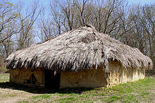 Daub is usually created from a mixture of ingredients from three categories: binders, aggregates and reinforcement. Binders hold the mix together and can include clay, lime, chalk dust and limestone dust. Aggregates give the mix its bulk and dimensional stability through materials such as mud, sand, crushed chalk and crushed stone. Reinforcement is provided by straw, hair, hay or other fibrous materials, and helps to hold the mix together as well as to control shrinkage and provide flexibility.[9] The daub may be mixed by hand, or by treading – either by humans or livestock. It is then applied to the wattle and allowed to dry, and often then whitewashed to increase its resistance to rain. Sometimes there can be more than one layer of daub. At the Mitchell Site, the anterior of the house had double layers of burned daub.[10]