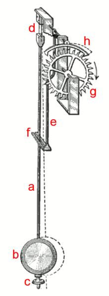 In horology, the anchor escapement is a type of escapement used in pendulum clocks. The escapement is a mechanism in a mechanical clock that maintains the swing of the pendulum by giving it a small push each swing, and allows the clock's wheels to advance a fixed amount with each swing, moving the clock's hands forward. The anchor escapement was so named because one of its principal parts is shaped vaguely like a ship's anchor.