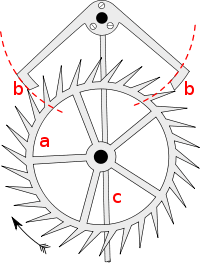Deadbeat escapement, showing: (a) escape wheel, (b) pallets showing concentric locking faces, (c) crutch.