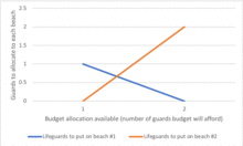 Another example, commonly used in operations research courses, is the distribution of lifeguards on beaches (a.k.a. the "Life's a Beach" example).[4] The example describes two beaches with lifeguards to be distributed on each beach. There is maximum budget B that can be distributed among the two beaches (in total), and using a marginal returns table, analysts can decide how many lifeguards to allocate to each beach.