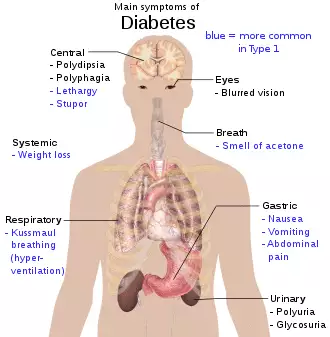Diabetes mellitus (DM), commonly known as diabetes, is a group of metabolic disorders characterized by a high blood sugar level over a prolonged period of time.[11] Symptoms often include frequent urination, increased thirst and increased appetite.[2] If left untreated, diabetes can cause many complications.[2] Acute complications can include diabetic ketoacidosis, hyperosmolar hyperglycemic state, or death.[8] Serious long-term complications include cardiovascular disease, stroke, chronic kidney disease, foot ulcers, damage to the nerves, damage to the eyes and cognitive impairment.[2][10]