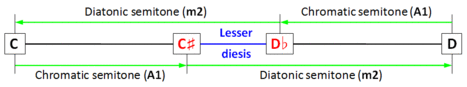 Diesis defined in quarter-comma meantone as a diminished second (m2 − A1 ≈ 117.1 − 76.0 ≈ 41.1 cents), or an interval between two enharmonically equivalent notes (from C♯ to D♭). |