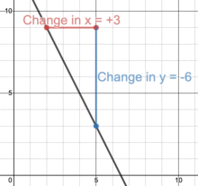 The derivative of at the point is the slope of the tangent to .[3] In order to gain an intuition for this, one must first be familiar with finding the slope of a linear equation, written in the form . The slope of an equation is its steepness. It can be found by picking any two points and dividing the change in by the change in , meaning that . For, the graph of has a slope of , as shown in the diagram below: