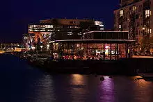 Restaurant Basilica at the shoreline of Kellosaarenranta by night in Ruoholahti, Helsinki, Finland