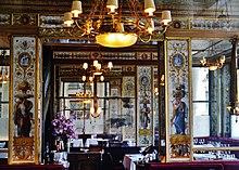 Taverns also served food, as did cabarets. A cabaret, however, unlike a tavern, served food at tables with tablecloths, provided drinks with the meal, and charged by the customers' choice of dish, rather than by the pot.[28] Cabarets were reputed to serve better food than taverns and a few, such as the Petit Maure, became well-known. A few cabarets had musicians or singing, but most, until the late 19th century, were simply convivial eating places.[27][28] The first café opened in Paris in 1672 at the Saint-Germain fair. By 1723 there were nearly four hundred cafés in Paris, but their menu was limited to simpler dishes or confectionaries, such as coffee, tea, chocolate, ice creams, pastries, and liqueurs.[28]