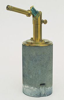 Edward John Dent, a chronometer and clockmaker in London, was working in the 1830s on a simple contrivance that would allow the public to set clocks correctly based on the transit of the sun (more complex and expensive transit telescopes had been developed by Ole Rømer in 1690). By 1840 he felt he had come to a suitable design using shadows, however when he communicated his ideas to Mr J.M. Bloxam (a barrister), he found he had also been working on his own design using reflections, which Dent felt was superior. The two formed a partnership and worked together on the device, and after a further 2 years work they finalised the design and patented it (GB Patent 9793 of 1843), with Mr Dent manufacturing and selling it as Dent's Dipleidoscope.[1] The instrument could use the moon as well as the sun and when correctly calibrated and aligned the accuracy was said to be less than a second. Dent exhibited the device at the Great Exhibition of 1851. After Edward Dent died in 1853, his son Frederick William Dent took over manufacture.