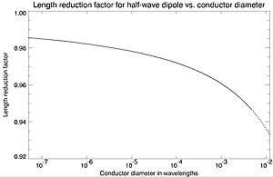 where λ is the free-space wavelength, c is the speed of light in free space, and f is the frequency. The adjustment factor k which causes feedpoint reactance to be eliminated, depends on the diameter of the conductor,[23] as is plotted in the accompanying graph. k ranges from about .98 for thin wires (diameter, 0.00001 wavelengths) to about .94 for thick conductors (diameter, 0.008 wavelengths). This is because the effect of antenna length on reactance (upper graph) is much greater for thinner conductors, so that a smaller deviation from the exact half wavelength is required in order to cancel the 43 Ω inductive reactance it has when exactly λ/2. For the same reason, antennas with thicker conductors have a wider operating bandwidth over which they attain a practical standing wave ratio which is degraded by any remaining reactance.
