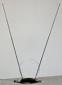 In radio and telecommunications a dipole antenna or doublet[1] is the simplest and most widely used class of antenna.[2][3] The dipole is any one of a class of antennas producing a radiation pattern approximating that of an elementary electric dipole with a radiating structure supporting a line current so energized that the current has only one node at each end.[4] A dipole antenna commonly consists of two identical conductive elements[5] such as metal wires or rods.[3][6][7] The driving current from the transmitter is applied, or for receiving antennas the output signal to the receiver is taken, between the two halves of the antenna. Each side of the feedline to the transmitter or receiver is connected to one of the conductors. This contrasts with a monopole antenna, which consists of a single rod or conductor with one side of the feedline connected to it, and the other side connected to some type of ground.[8] A common example of a dipole is the "rabbit ears" television antenna found on broadcast television sets.