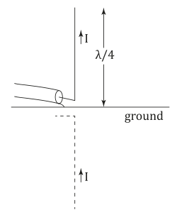 The "vertical", "Marconi", or monopole antenna is a single-element antenna usually fed at the bottom (with the shield side of its unbalanced transmission line connected to ground). It behaves essentially as a dipole antenna. The ground (or ground plane) is considered to be a conductive surface which works as a reflector (see effect of ground). Vertical currents in the reflected image have the same direction (thus are not reflected about the ground) and phase as the current in the real antenna.[20] The conductor and its image together act as a dipole in the upper half of space. Like a dipole, in order to achieve resonance (resistive feedpoint impedance) the conductor must be close to a quarter wavelength in height (like each conductor in a half-wave dipole).