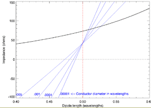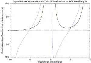 The feedpoint impedance of a dipole antenna is sensitive to its electrical length and feedpoint position.[9][10] Therefore, a dipole will generally only perform optimally over a rather narrow bandwidth, beyond which its impedance will become a poor match for the transmitter or receiver (and transmission line). The real (resistive) and imaginary (reactive) components of that impedance, as a function of electrical length, are shown in the accompanying graph. The detailed calculation of these numbers are described below. Note that the value of the reactance is highly dependent on the diameter of the conductors; this plot is for conductors with a diameter of 0.001 wavelengths.