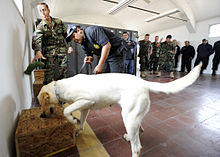 Discrimination learning can be studied in both humans and other animals. Animals can use discrimination learning to help them survive, be trained for assisting humans in tasks, and much more. A dog might be trained to use discrimination learning to detect differences in complex odor compounds so that they are able to sniff out different drugs to assist police. Predator can also use discrimination learning to distinguish between two camouflaged prey.[4] Discrimination learning teaches us more about what other animals are capable of conceptual thought. Humans can use discrimination learning to detect danger, learn about differences, and more. One example of discrimination learning in humans would be a baby who reacts differently to their mother's voice than to a stranger's voice.[5]